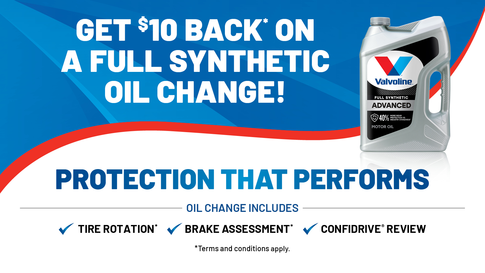 Includes up to five quarts of oil, multi-point vehicle inspection, 4-tire rotation, and chassis lube (where specified by manufacturer). Additional oil over 5 quarts costs extra. Additional charges may apply to the retail price including a fluid and/or filter disposal and/or recycling fee. An additional service charge of up to 13% no greater than $49.95 may be added for shop supplies and equipment cost. Other restrictions, fees, and taxes may apply. Most vehicles. Participating stores only. See store for complete details. Visit www.valvolineglobal.com to learn more about additional benefits.